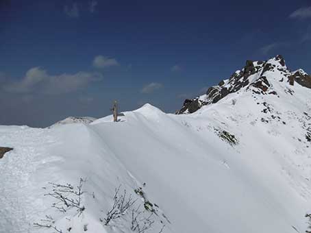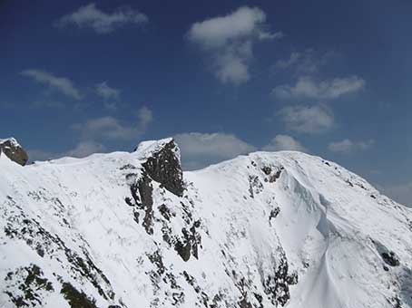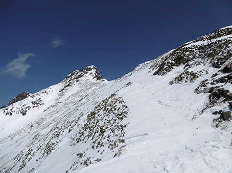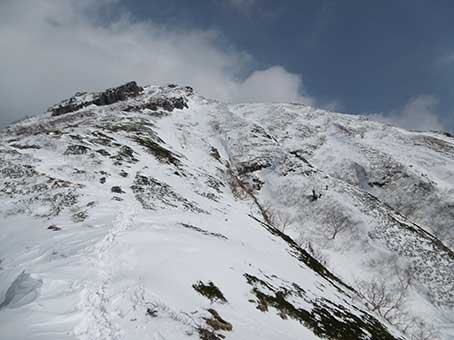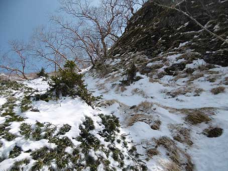 下部岩壁帯の基部に11時半頃到着し 下部岩壁帯の上に12時頃上がった。 上部岩壁帯の下をトラバースするところは雪が少なく、足場が不安定で 上部岩壁帯の横を登るところも雪が少なめで、アイゼンの効きに不安を感じた。 |