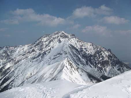 御小屋尾根の幕営地あたりから中央稜を望む 第二岩壁と書いたところは上部岩壁帯とも呼ばれているが その脇を登るところが雪が少なくてアイゼンが深く刺さらず不安を感じたところ。 |