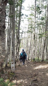 朝日岳の頂上から100メートル下って、しばらく高低差のあまりない登山道を進み、また緩い登りが始まる。