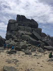 大きな岩がごろごろしているところを登っていき、最後に石の門のようなところをくぐると金峰山の頂上だ。