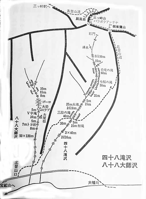 三つ峠は岩登りのゲレンデがあるが、沢登りの対象になる沢もあることを知った。 三つ峠山の北側にある四十八滝沢という沢で、いかにも滝が多そうな名前のとおり、 短い流程のなかに登攀可能な滝が連続している。 滝を登っているうちに、どんどん標高をかせいでいける. 海の日の三連休の初日で高速道路は車が混雑することが予想されたので バイクで行くことにした。 千葉の自宅を朝6時前に出発した。 相模湖まで断続的に30キロの渋滞だった。バイクで良かった。 河口湖方面へ分岐した中央自動車道の都留ICでおりた。 登山口までコンビニがないという情報があったので、 ICを出た所で逆へ向かいコンビニに寄っておにぎりと煎餅を買って行った。 山へ向かう方にもヤマザキデイリーストアーがあった。 好日山荘の人のブログでは 三つ峠山の北口登山道の登山口までの林道は未舗装の悪路で、 四駆以外では入って行かない方が良く、バス停のある広場に駐車することを勧めていた。 私はバイクだったが、オフロードではないので、 未舗装になったところを少し進んだところ駐車した。 沢支度をして出発したのは8:45頃だった。 今回はデジカメを忘れてきたので写真はガラケーで撮った。 遡行図は日本登山体系の「東京近郊の山」から拝借した。 |