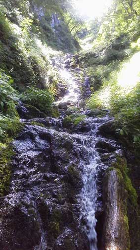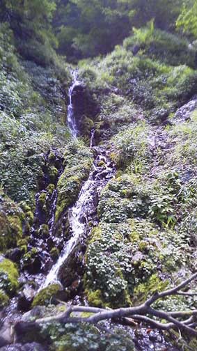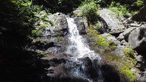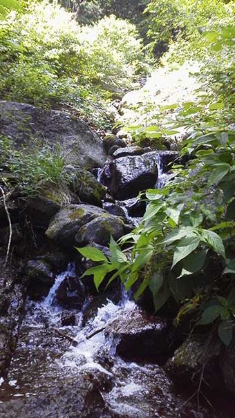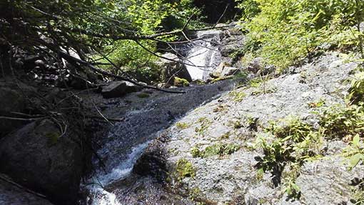 沢登りなので水はいくらでもあると思い、水筒は空で来てしまったが 登山口に着いた時には喉が乾いていた。 ”初滝”あたりから入渓するのが一般的のようだが、暑くて早く沢に入りたい気分だったので 登山道が沢に近づいたところで沢に入ることにした。 登山口から30分くらいの所だったとおもう。9:50ころ 待望の水を飲んだ。 薮や倒木がうるさい感じのところもあるが 割愛してしまうのはもったいないようなナメ滝もあった。 |