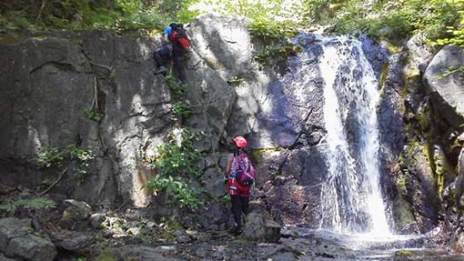 ”初滝”(15メートル) 下から登ってきて最初に現れる滝という意味か。10:30ころ 大滝以外はフリーで登れるものと思っていたが、3人パーティーがロープを使って登っていた。 ガイドと客2人かもしれない。 左側から登って斜上するバンドを右に登り、最後は草の生えた岩場を登っていた。 私はこの日は最初から結構くたくただったので、休憩をかねてゆっくり登り終わるのを待っていた。 30分くらい待って、先行パーティーが見えなくなってから、登り始めた。 左側は登り始めが難しそうだったので右側の乾いた岩を登った。 ここも結構傾斜は急で生えている草で足場が隠され登りにくかった。 最上部は右寄りへ逃げた。 |
