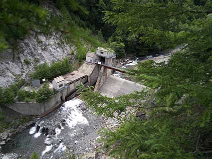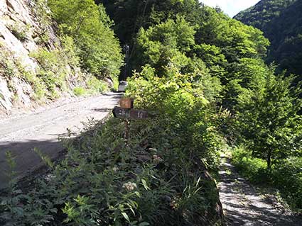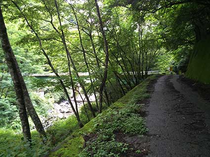 | 11:20 1時間ほど歩いて最初のチェックポイントの橋に着いた。旧道は直進だが、新しい道は橋を渡る。 橋を渡る時に見える堰堤とは別に渡った先の支流に発電施設があり、その右側に林道がつづいている。 林道は、発電施設に向かうものと先へ進むものに分岐して、右へ進むと河原に出る。 |