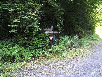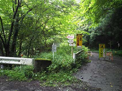 | 8:30 東俣林道がここで行き止まりのように見えるが、 怖じけずに看板の横へ進んでいく |