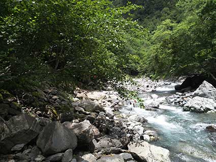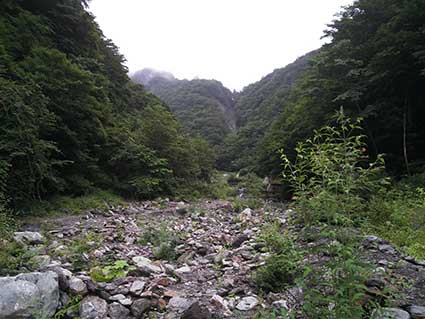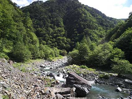11:30 河原に出たところ。 靴を沢靴に換え、沢のスパッツも着けた。 この写真の正面に見えている峠が八丁峠で、その斜面はガレ場になっている。 登路はガレ場のの左側にある。 この景色の見えているところから右岸へわたり、 登山道を500メートルほど進むと、八丁峠の取り付きになる。 |