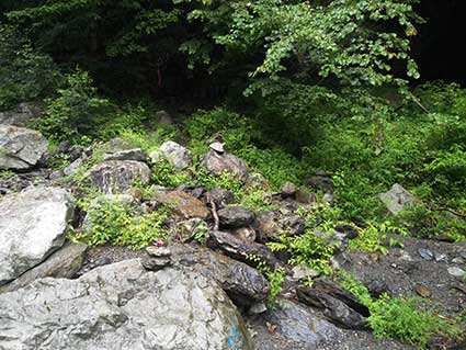 12:00 八丁峠への取り付き。 ケルンと赤テープが目に入った。 この頃から雨が降ってきた。 |