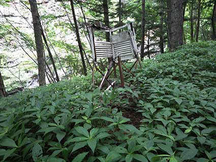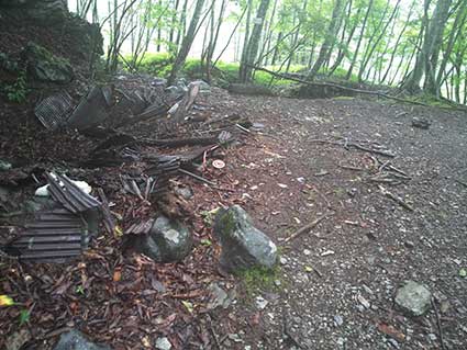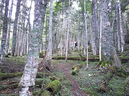 12:55 八丁峠には以前に小屋があったようで、 トタン板や食器などが散乱していた。 林業関係の人が使っていたのだろうか。 ここから先すぐに降り始めるのかと期待していたが まだ少しのぼりがあり、それから下りが始まった。 トラバース道を予想していたが、グングン下る感じだった。 |