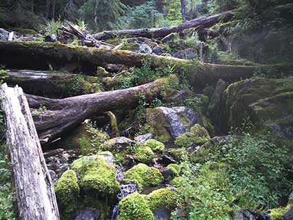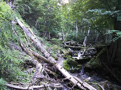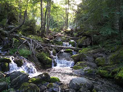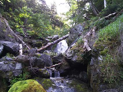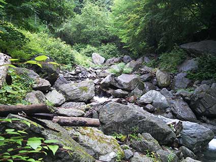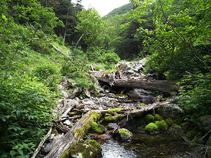 | 池ノ沢は倒木が多く遡行しにくいと評判だ。倒木や大岩などで遡行出来なくなったら右岸に登山道を探してみると見つかるかもしれない。 初めのうちは倒木を超しながら沢伝いに登っていった。 |