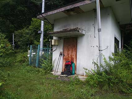 14:10 電力関係の小屋 保利沢小屋と呼ばれている。 中には入れないが、小さいひさしの下で雨宿りができる。 幕営できる空き地もあった。 雨が大分降ってきていた。 ここで暫く休んだ。 |