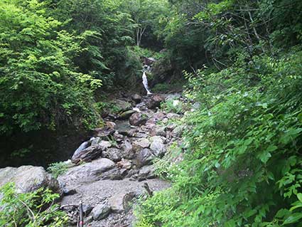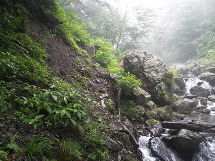 | 二股まで右岸をたどる。 右の写真のようにロープが垂れているところもあり、ここを登っていく。 | |