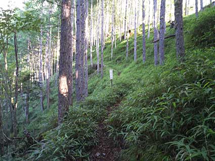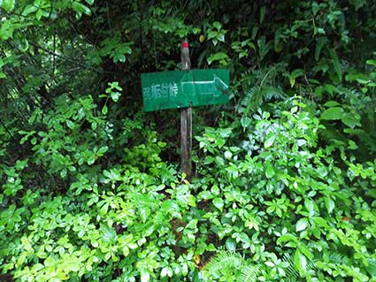 対岸に取りつくと、道があり、こんな指導票もあった。 登山道がはっきりしないところにこんなものを見つけると有り難い。 雨で沈んだ気持ちもすこし元気づけられた。 |