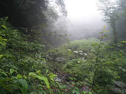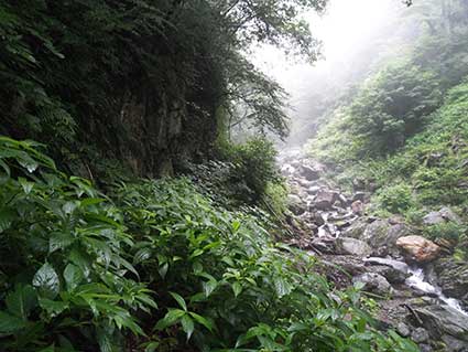 | 道はわかりやすいが、上の方は笹が生い茂っており、雨と朝露でズボンも靴もびしょびしょだった。 沢装備だったので良かった。峠の近くには水場が2カ所有った。 2つめの水場には幕営適地もあった。峠には水場はないので、幕営するなら2つめの水場の前が良いだろう。 |