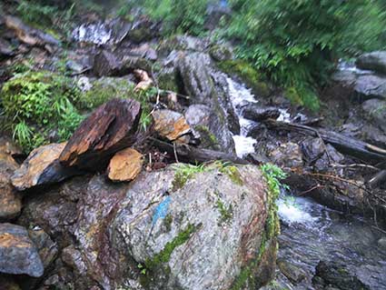 | 二股に到着した。視界が不良だったが、GPSで位置を確認した。岩の青ペンキも確認できた。 地図で予想するのと少し違うが、右股の方へ30メートル位進んでから取り付きがある。 |