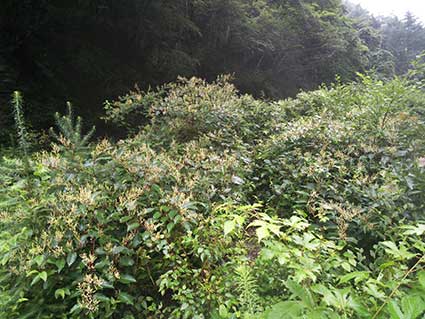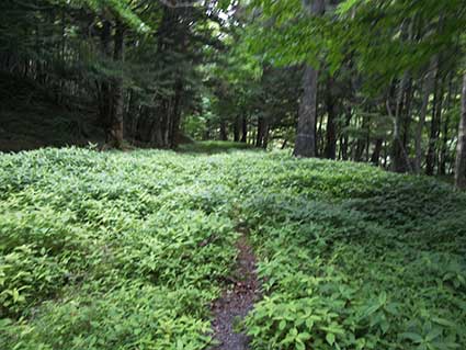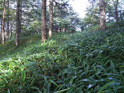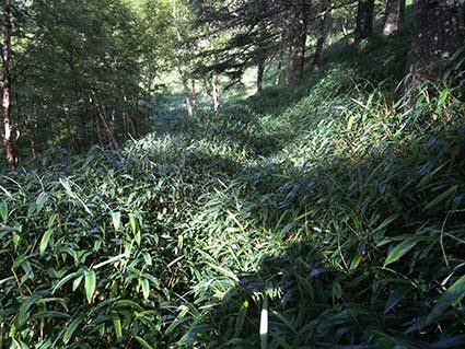 | 同じような写真になってしまったが、熊笹が深いところを進んでいく。よく整備された登山道とは違う。 右の写真の中央やや上には峠の標柱が写っている。 |