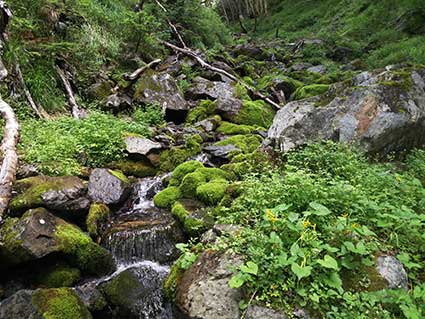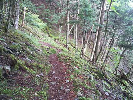 | 池ノ沢池よりも上流にも、しばらく沢には水が流れていた。岩を覆い隠すように苔がついているのが風情があって良かった。 水が涸れ、小びろいところで、進行方向正面をハイマツに遮られた。 ハイマツ帯は3つほどあり、はじめのハイマツ帯は右端に登山道が確認できた。 2つめのハイマツ帯も右端を迂回するようにクリヤーできた。3つめのハイマツ帯は、弱点をねらって藪漕ぎすべきだったようだが 私は前2つと同じようにハイマツ帯を避けられるところまで右へ右へと登っていった。 どこまで登ってもハイマツ帯がなくならないので、かなり高い位置でハイマツを横切るように藪漕ぎしたら、急なガレ場の中の高いところに出た。 その先どういうふうに進もうか迷ったが、少し下り気味にガレ場を横切り、さらにハイマツ帯を横切ったら どうやら登山道らしいところに出ることが出来た。 |