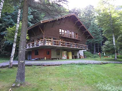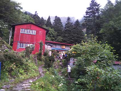 7:50 二軒小屋に着いた。立派なロッジがある。 途中で飲むためのポカリスエットの500mlと 幕営地で飲むための缶ビールを買った。 |