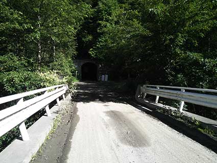 二軒小屋の先の道が少し分かりづらい。 2万5千分の1の地図も、新しいものでも正しくない。 くねくね迂回する部分があるが道なりに進んでいけば トンネルが出てきて、その先に東俣と西俣の分岐がある。 |