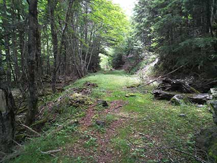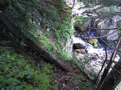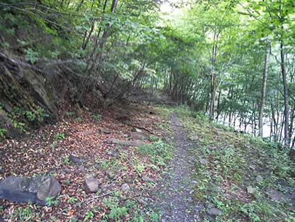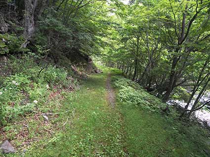 | 手前は崩落しているが奥にはきれいな道がつづいているのが分かる。道をめざしてガレ場をわたる。 | |