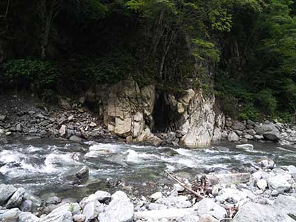 | 左岸を少し進むがまた河原へ降りざるをえなくなる。 | こんな岩壁に阻まれるので徒渉せざるを得ない |