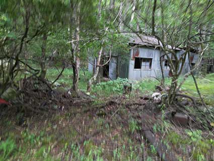 道を進んでゆくと広々としたところにでた。 渓流釣りの人がテントを張っていた。 こんな廃屋もあった。 余り広いので道を見失った。 |