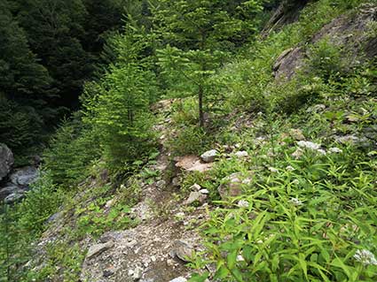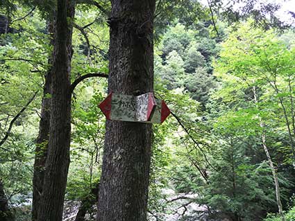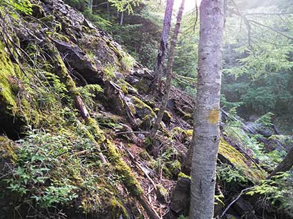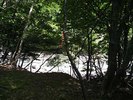 | さすがにここは登れないな、というようなところは右岸に逃げたら登山道があった。黄色いペンキが何カ所が着いているのを見つけて嬉しいしかった。 中間部は右岸をたどった部分が多かったと思う。 |