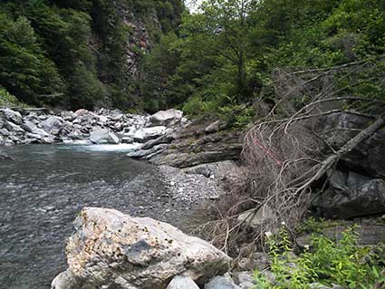 | 河原の枝にも赤リボンがついていた。また徒渉した。 | 少し河原を歩き、また左岸に戻った。 |