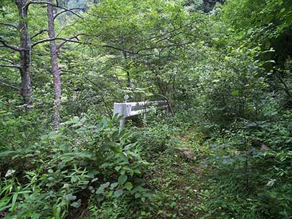 八丁峠への登りはワイヤーやロープなどがたくさん着いていて、 無理に作った道と想像していたが、 このような柵がついているところもあり、これは年代を感じさせられた。 この柵の古さは、伝付峠への道が通行不能になる前から 有ったもののように思えた。 |