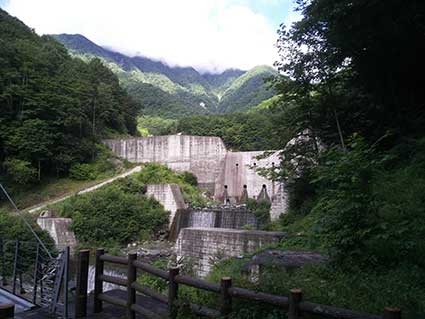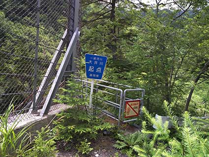 | 13:00 まだかまだかと思っていたダムがやっと出てきた。 河原から歩いていて、このダムを登ったという記録もあったが、左岸を歩いていれば、ダムをよじ登る必要はない。 大井川起点の看板があった。 少し先の小沢の流れているところでそうめんを食べた。 ダムの位置は2万5千の地図にはでていないが、国土地理院のHPでみる地図には遠慮がちに破線がかかれている。 帰ってからgoogle mapの航空写真を見たらはっきり写っていた。地図に位置を書き込んでおくと良いと思う。 |