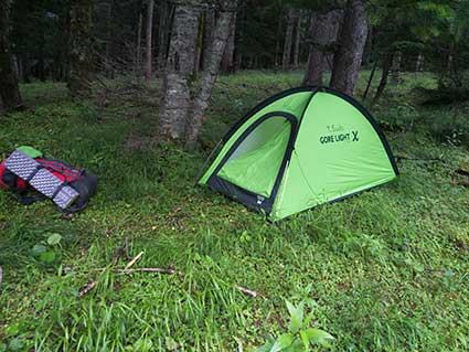 15:30 草むらの向こうに、峠への取り付きがある。 峠までは約500メートルの登りだ。 この時点で二軒小屋まで行くのは無理だと思っていたが、 伝付峠までは辿り着きたいと思っていた。 伝付峠には水場があるが、 どこでも幕営出来るように水は2.5L汲んでおいた。 この先は道がはっきりしており、歩きやすいが 雨で意気消沈しているところに疲労困憊して 1700メートルくらいのところで幕営することにした。 16:30頃だった。 |