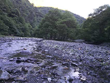 この辺は道がはっきりしないので河原を歩いた方が良い。 左岸に小屋が見えた。 何回か徒渉しながら、池ノ沢のの出合いに7:00頃到着した。 GPSで確認した。 |