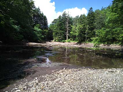 池ノ沢小屋が1900メートルくらいで 池ノ沢池は2350メートルくらいだ。 2〜3時間でのぼれるだろうと予想していた。 池が近くなってくると、沢は苔がむした日本庭園のような感じになってきた。 9:40池ノ沢池に到着。小屋から2時間20分くらいだった。 ”南アルプスの真珠”などと呼ばれているので、期待して来たが 水はかなり少なく、沼のようになっていた。 もう少し水が多ければ良い景色になっているのだろうが残念だった。 反対側へ回ると沢からきれいな水が流れ込んでいる場所が有ったので ここで休憩してそうめんをたべることにした。 そうめんは疲れているときもいつも喉越しが良い。 9:40−10:20 池ノ沢池にゆっくり滞在した。 (ここで熊を目撃したという記録もあったことをあとで思い出した。) |