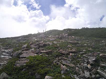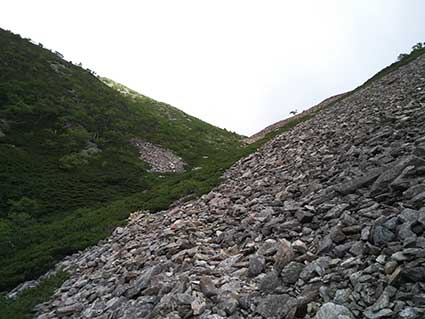 | ガレ場の下部に登山道らしき部分があった。 写真中央右よりのコルを目指して進んだ。 |