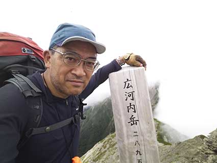 14:00 やっと広河内岳の頂上に到着した。 2895メートルと書いてある。ほとんど2900メートルだ。 雲に囲まれていて視界は余り良くなかった。 |