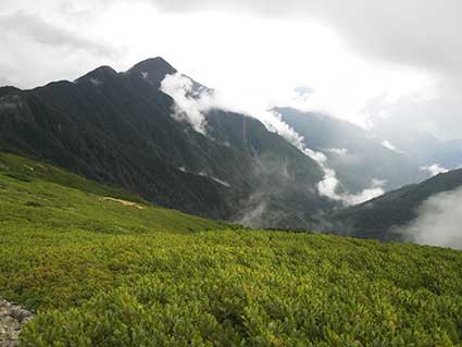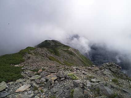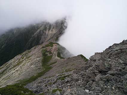 | 農鳥岳方面。こちらへ進むべきだったが | こちらの尾根へ進んでしまった。 雲が薄くなり太陽が出て来てから、南西へ向かっていることが分かった。 進路は北へ向かうはずなので、地図とGPSをくらべて間違いに気づき 山頂へ引き返した。30分くらいロスした。 |