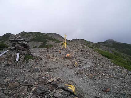 コルのちかくに登山道らしい部分がまた出てきたので 印を探しながら頂上への斜面を登っていった。 ガスが出てきて視界は悪かった。 |