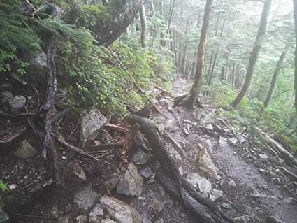 8:20 駐車場に帰還した。 毎日午後になると雨に降られて、天気は今ひとつだったが かなり充実した山行ができ満足した。 自宅には12:30頃着いた。 翌8月7日には台風が四国へ上陸し、本州にも影響が出始めていたので 早く下山して来て良かった。 |