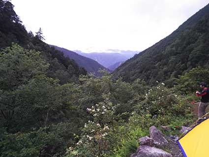 | 比較的平らなところにテントを張ることが出来た。日没のころには雨は小雨になっていた。 濡れたものを着たまま、上に乾いたフリースを着て、着干をした。 夕食は重いものから先に食べることにしてレトルトカレーとスパゲッティで、カレースパにした。おいしく食べられた。 電話は通じたので自宅で現状報告をした。ラジオで台風5号の事が気になった。 台風5号は迷走台風で山行中の台風の位置予想がむずかしかった。 寝る頃には服も大体乾いた。下半身はシュラフに入り、上半身はダウンジャケットを着た状態で寝た。 8月4日 朝起きたらテントの外が明るくなっていた。4:30頃だった。朝食は赤いきつねを食べた。天気は晴れていた。 6:00頃沢装備で出発した。 |