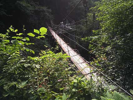 左膝と、数年前に捻挫した左足関節が痛かったので ゆっくり降りた。 数人の登山者に追い越された。 下るルートにも所々登り部分が含まれていた。 大きな吊り橋があると発電設備が現れる。 |