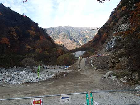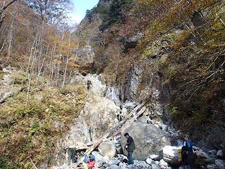 ドンドコ沢のルートはだいたい左岸を行くのだが、出発してまもなく治山工事のため一旦右岸に渡るところがあった。