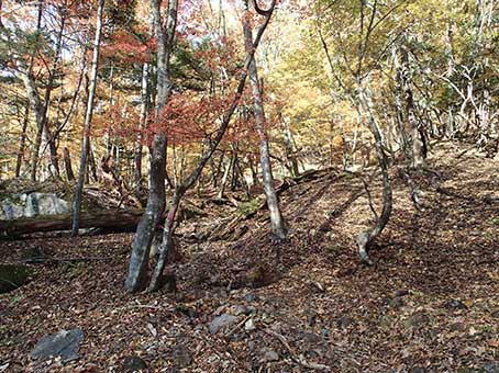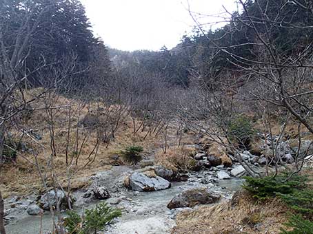 五色の滝から暫く登って尾根を越えると、沢の源流の雰囲気のところにでる。