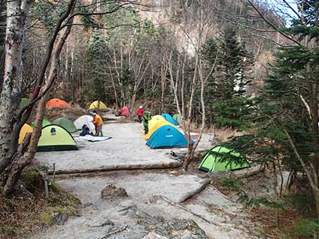 テント場は込んでいたが一番手前の小さいスペースが空いていたのでそこに張った。トイレに近くて良い場所だった。