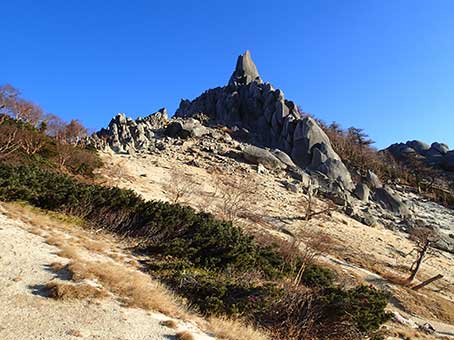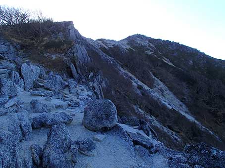 | 11月5日(日) 朝4時頃起床。ペットボトルの水は凍ったが、水筒の水は凍らなかった。 テント場では暗いうちからテントを片付けている人が多かった。 朝食は赤いきつねを食べた。 5時半頃から薄明るくなってきたのでテントをたたみ、5:50に出発した。 地蔵岳の賽の河原までは急登が続く。 300メートルくらい登るのだが、7時ちょうど頃に到着した。 オベリスクには登らなかった。 |