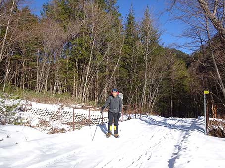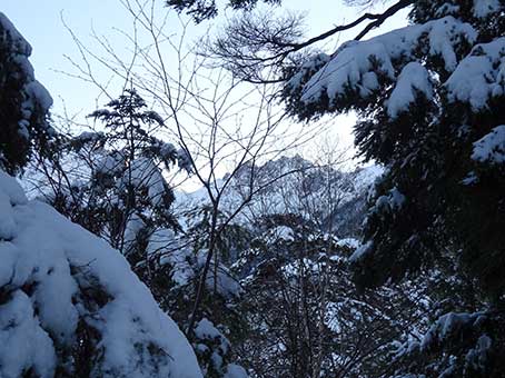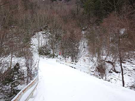 林道には雪が積もっていたが、薄く積もった雪の下は氷結していた。 橋の上で滑ってころんだ。 橋を渡ったところが登山口だ。1時間以上かかった。 標高は1300メートルくらいだ。 ここから福栃山頂上か、越百小屋まで標高差1000メートルくらいだ。 12時になっていた。 |