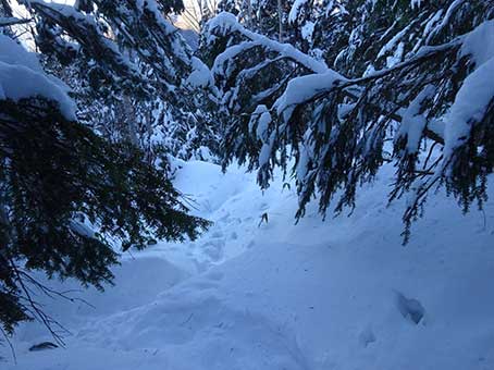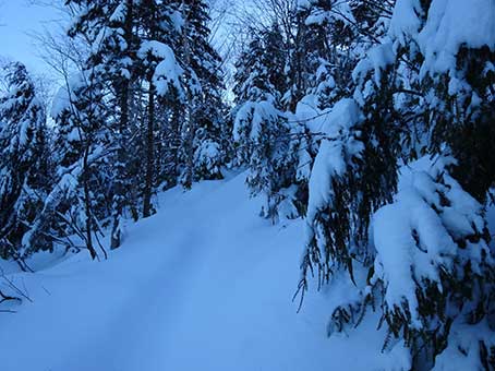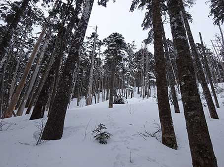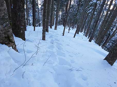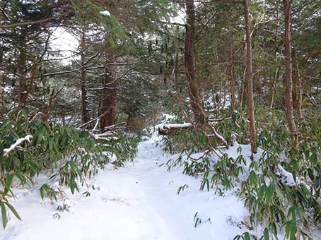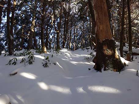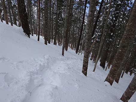 水場の先から傾斜が急になる。 雪も深くなった。 この登山道は積雪期に分かる目印がほとんどない。 特に傾斜が急になってからは目印が全くなく、 夏道と同じところをのぼることはできないので トラバース道の入り口を見つけることは難しい。 |