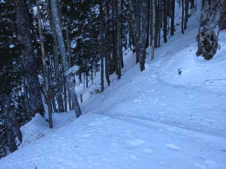 高度計では2300メートルを超え、福栃山頂上付近の雰囲気になっていたが、12時を過ぎた。 おそらく夏道よりは南よりだろうと思った。 夕方まではまだまだ時間はあるが、無事に帰ることを考え無理はしないことにした。 13時頃、高度計が2330をさしていた地点で引き返すことにした。 GPSで位置を確認しようとしたが低温のため電池のパワーが足りずうまくいかなかった。 電池を交換する気にもならなかった。 降り始めたら間もなく登ってくる人が見えた。 3人いた。 トップで登ってきた人に「ラッセル有り難うございました。助かりました。」と言われた。 自分は降りてしまうが、この人達の助けになれば少し苦労が報われるような気がした。 2人はわかんで登ってきており、私よりも年上の感じだった。 朝6時頃出て来たとのことだった。 3番目の人は40代くらいの印象の人で、輪かんでは胸までもぐるので諦めた、と言っていた。 スノーシューではどのくらいもぐったか聞かれたので、股くらいまでもぐったと答えた。 歩行時にもぐっている深さと、跡に残っているトレースの深さとは違う。 その人は急斜面の途中で幕営することにして整地していた。 スノーシューを履いたまま急斜面を降りていった。 時々滑り落ちた。 急斜面の上り下りは以前のevo assentの方が歩きやすかったと思う。 |