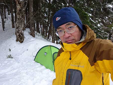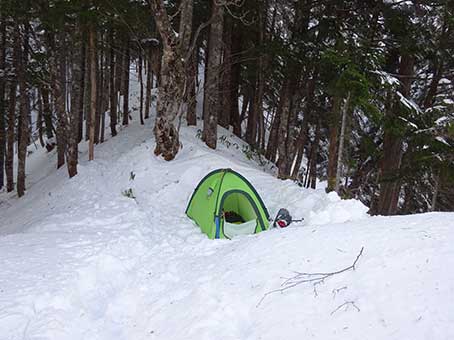 段々雪が深くなってきたが、初日はアイゼンもスノーシューもつけなかった。 この日は5時間くらい歩こうと考えていた。 15時30分1950メートル付近で幕営することにした。 樹林帯の中で風は無かった。 夕食は定番の日清焼きそばをキャベツ、ハム入で食べた。 |