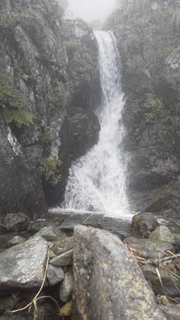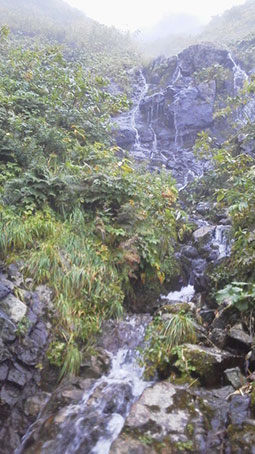 最後の二股に14時頃到着した。 普通は左へ進む人が多いと思うが、3人パーティーは右へ進むという。 航空写真で小屋の水場に続く窪みが写っていたという。 私はオーソドックスな左を進むことにしてここで分かれた。 左俣にはまだ大きい滝場がが3つくらい現れた。 1カ所はザックをかついだままでは登れず、また空身で登ってザックを引き上げた。 |