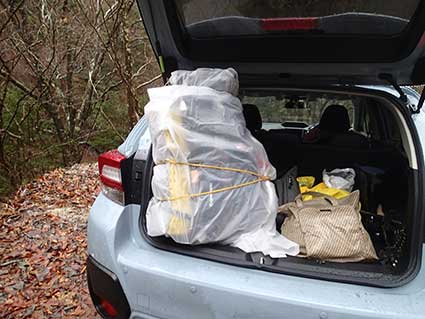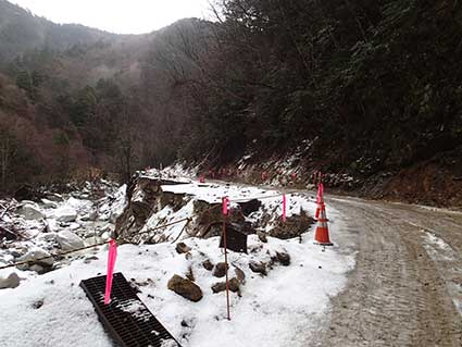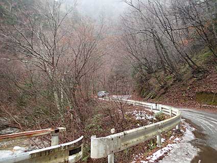 林道を走っていくと、ダムの手前で通行止めになっていた。少し手前の道が広くなっているところに車を止めた。 近くに横浜ナンバーの車が止まっていた。その人は空木岳へ行くつもりだったと言っていた。どうしようかまよっているようだった。 私は別の目的地は用意していなかったので、林道歩きが長くなるが、予定どおり越百山へ向かうことにした。 林道のこの地点は標高1000メートル近いところだが雪ではなく雨だった。午前中いっぱいは雨が降る予報だった。 ビニールの雨合羽をザックにかぶせ、袖のところをしばり、テントの張り綱を使ってばたつかないようにした。 割とうまく固定出来た。カッパをかぶせるのにスノーシューでは邪魔になるので、わかんにした。 昨年よりも雪がすくなそうなので、わかんでも大丈夫だろうと判断した。傘は置いていくことにした。 ここには8:30頃到着したが、身支度をして出発したのは9:20頃だった。 歩き始めてから、道ばたに置いてきた車を撮った。 |