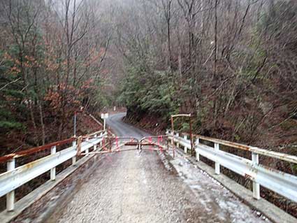 | 橋の上に作られたゲート。右端に人間が通れる隙間が作られている。ダムまでは約1キロだが、登りである。 ダムから駐車場までが1.6キロある。駐車場までの道も路肩の崩壊が激しかった。 今年の夏の豪雨の影響のようだ。 駐車場に到着したのが10:10頃だった。 そこから、福栃沢橋の登山口まで標高差が300メートルほどあり、ゆっくり登ると1時間半かかる |